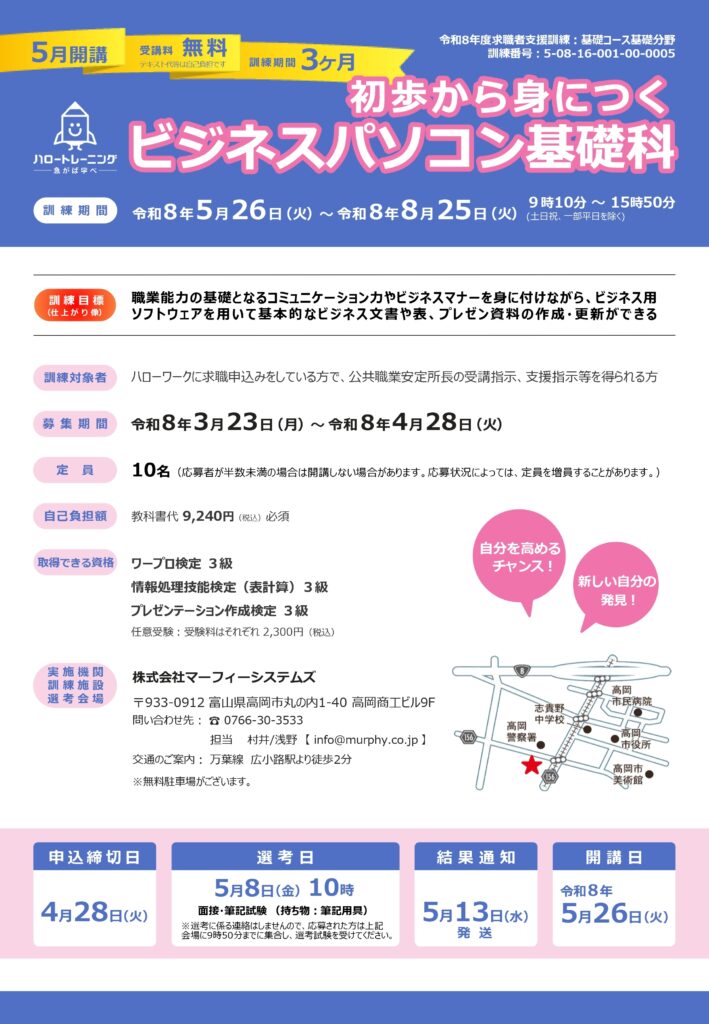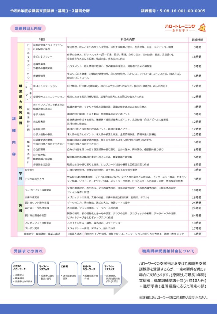 - 訓練期間: 令和8年5月26日(火)~令和8年8月25日(火) 9時10分~15時50分(土日祝、一部平日を除く)